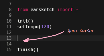 fitMedia()to insert the function between thesetTempandfinishfunctions.You may notice that when you paste the function, Earsketch produces some placeholder texts that we will need to replace later. These placeholder texts are also known as